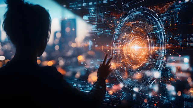 手指触摸虚拟屏幕,象征着未来科技的交互与控制。