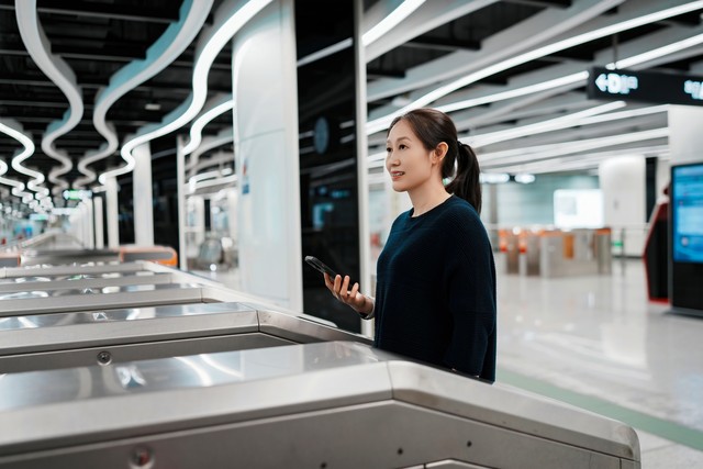 在现代城市环境中,年轻女子手持智能手机站在地铁旋转栅门前