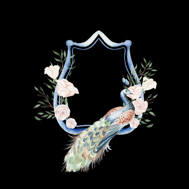 水彩蓝色婚礼徽章与peacoc。插图。水彩蓝色婚礼徽章与peacoc。