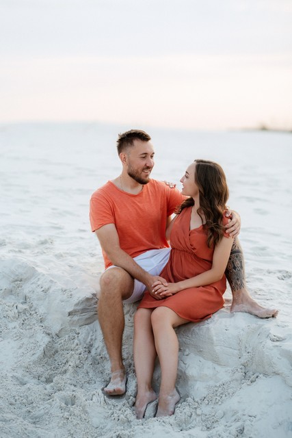 穿着橙色衣服的年轻夫妇和狗在沙漠白沙中