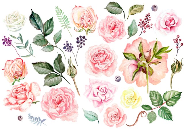 玫瑰、花蕾、树叶和浆果水彩套装。插图。玫瑰、花蕾、树叶和浆果水彩套装。
