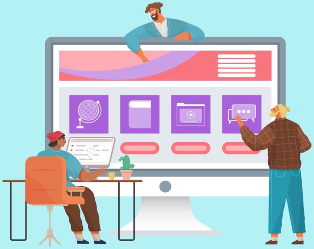 商务人士对使用网页和界面的角色进行分组。用于网页设计信息图形演示的存储和计算矢量概念。人们工作和交流商业技术。商务人士小组,网页设计师角色团队,使用网页和界面