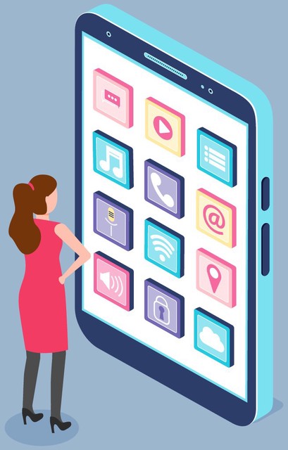 移动应用程序的开发,智能手机概念程序。人们站在手机附近,屏幕上有应用程序图标。电子设备的编程、软件开发、应用程序。从事智能手机移动程序开发的人,电子设备应用程序