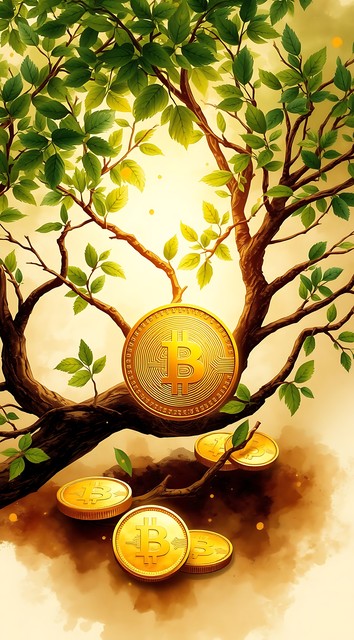 比特币和虚拟货币,金色的金币与树枝,自然元素中的发财树,共同构成了加密货币的世界。