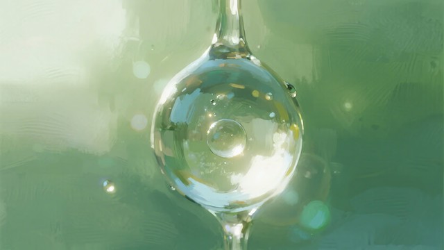 晶莹剔透的水滴特写,自然元素,绿色背景