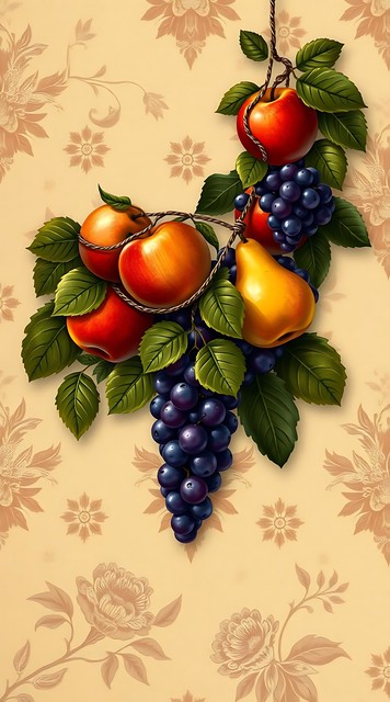 一幅色彩丰富、自然元素丰富的静物装饰画,以水果和绿叶为背景。
