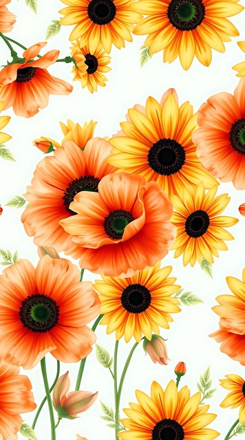 花卉图案,以橙色和黄色为主,点缀着向日葵和罂粟花的绿叶,自然元素与无缝图案相结合,为装饰背景增添生动色彩。