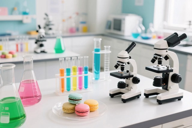 实验室中的显微镜与多彩物品,显微镜,马卡龙