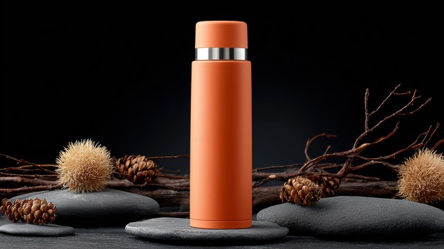 简约橙色保温杯与自然元素的静物摄影