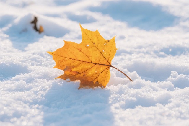 雪地中的一片金黄枫叶,自然景象,画面元素