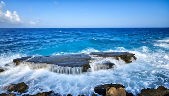 碧海蓝天,巨浪拍岸,岩岸礁石尽显自然力量。