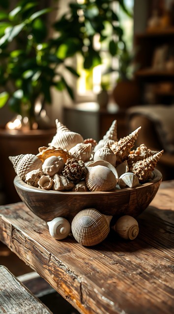 木质桌面旁,贝壳与绿植点缀的木碗,是自然元素家居摆件。