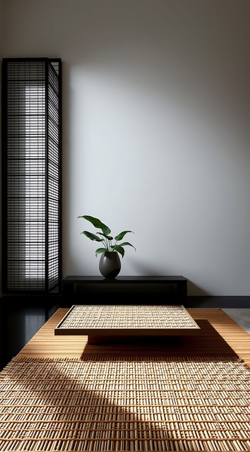 简约风格的室内,以竹席和绿植为装饰,搭配屏风和茶几,营造出自然元素的氛围。