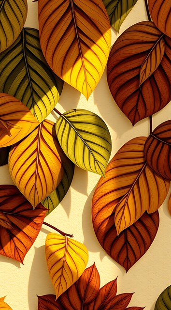 秋日的树叶铺满地面,自然元素与装饰图案交织成一幅生动的背景。