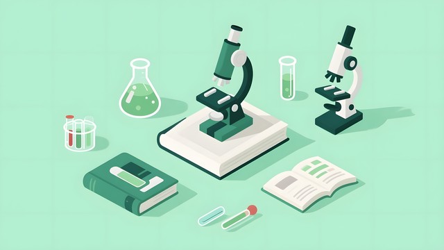 绿色背景中,显微镜、试管等实验器具与书本,凸显科学学习