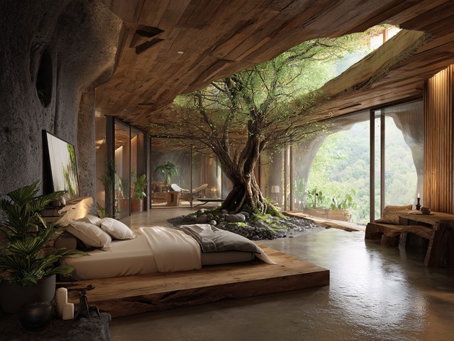 室内大树的独特卧室设计,大树,自然元素