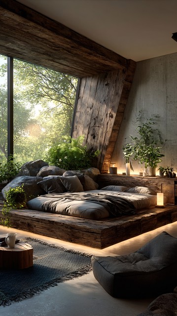 温馨自然风格的卧室室内场景,绿植,木质元素
