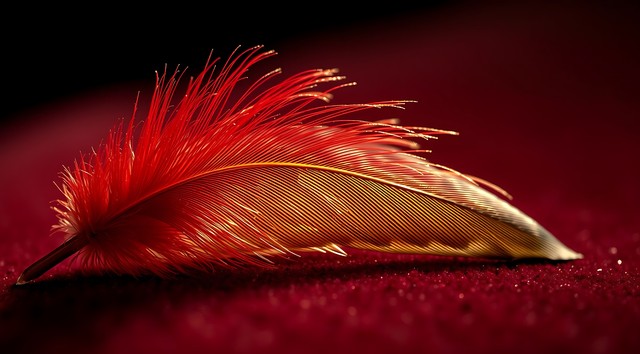 红色羽毛在金色背景前特写,展现自然元素中的动物羽毛之美。
