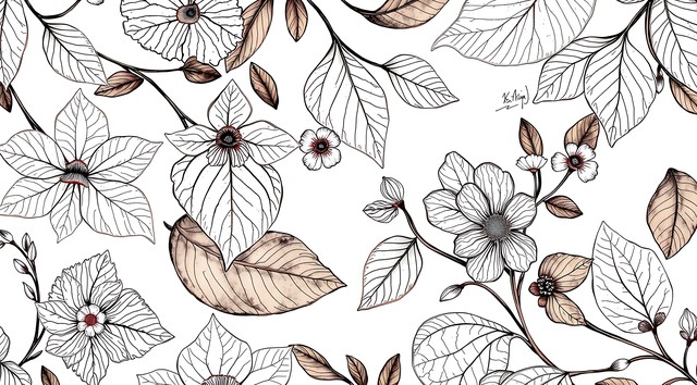 手绘的花卉以线条画的形式呈现,自然元素中的棕色花卉细节丰富。