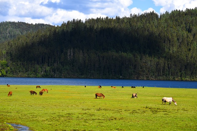夏季,云南香格里拉普达措国家森林公园绿草如茵牛马成群,蓝天白云,远山,森林,湖泊一幅美丽的自然画卷