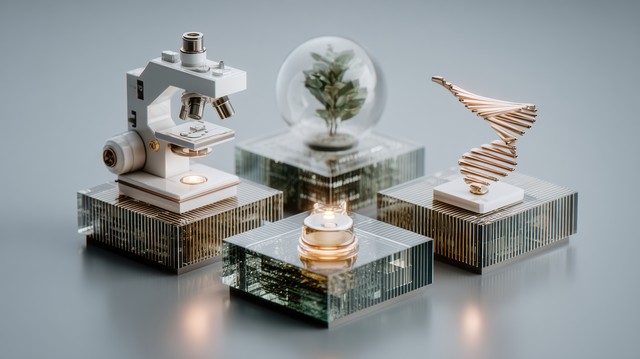 显微镜、DNA双螺旋与植物标本的艺术展示