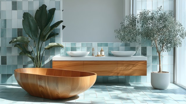 现代简约浴室设计自然元素与木质浴缸的完美融合