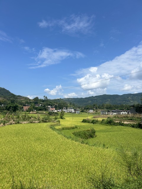 画面展现出乡村田园风光,大片绿油油的稻田在开阔的田野中铺展,生机勃勃。远处错落分布着房屋,周围青山环绕,天空湛蓝,飘着几朵白云,整体氛围宁静美好,充满自然的清新与乡村的静谧。
