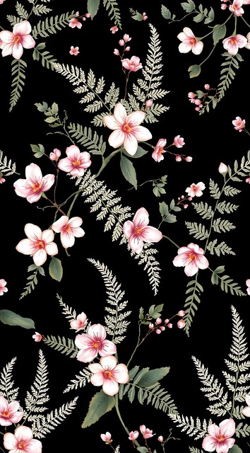 粉色花朵与绿色叶子相映,点缀着蕨类植物的黑色背景,形成一幅充满自然元素的印花图案。