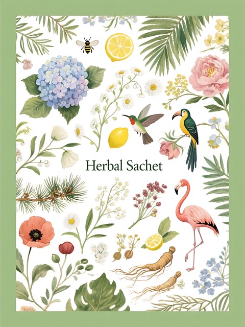 自然元素中,花卉、植物、鸟类和火烈鸟共同构成了一个生机勃勃的生态场景。