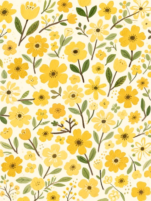 黄色花朵在手绘风格背景中绽放,绿叶点缀其间,构成一幅充满自然主题的植物元素画面。