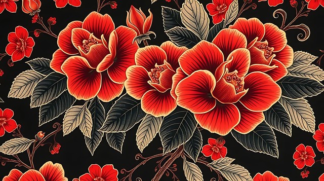 复古风格的黑色背景下,花卉图案装饰着自然元素的复古风格。