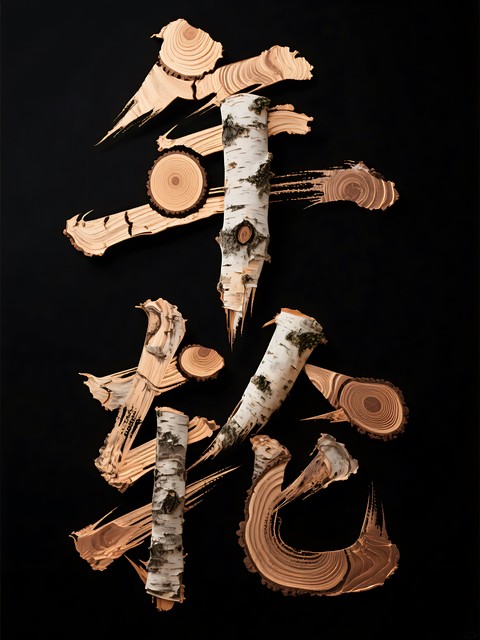 原木白桦树的木材艺术,以文字造型和手工创意,融入自然元素,展现独特的拼贴艺术。