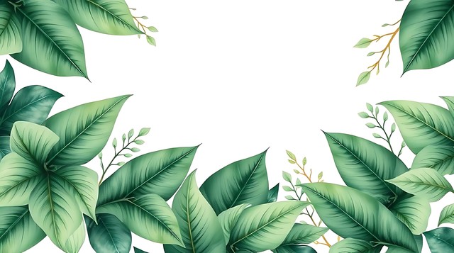 绿叶与自然元素交织,营造出清新的背景,点缀以绿色植物和叶饰。