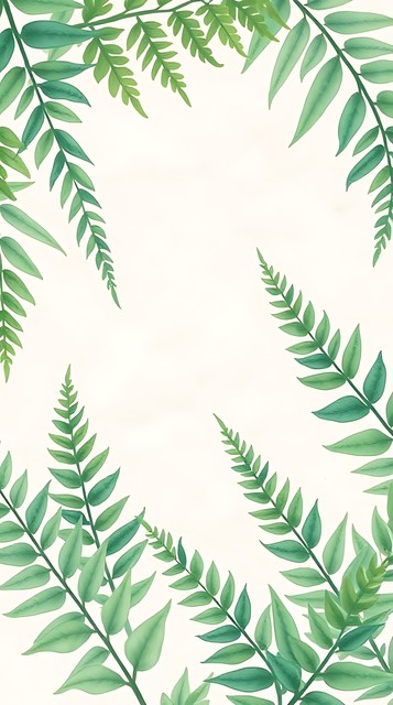 一幅以绿叶、水彩画为背景,装饰着蕨类植物和绿色调的自然元素。
