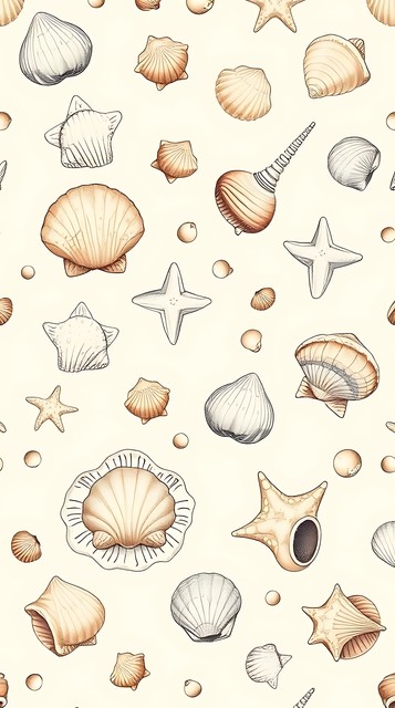 手绘风格中,贝壳与海星点缀着米色背景,展现出海洋生物的复古图案与自然元素。