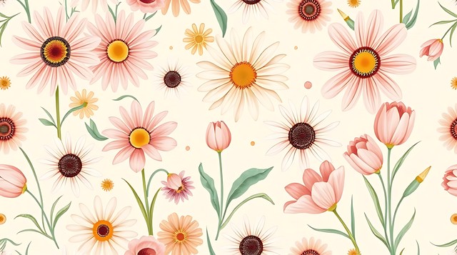 清新背景中,柔和色调的花卉图案,点缀着自然元素的雏菊和郁金香。