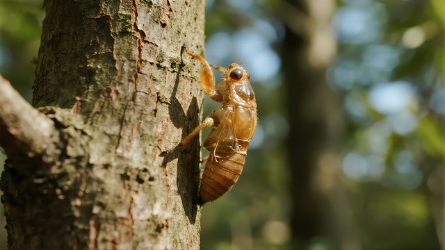 画面中是一只蝉蜕(蝉的幼虫外壳)附着在树干上,呈棕褐色,纹理清晰,背景是模糊的树林,展现出自然中的生
