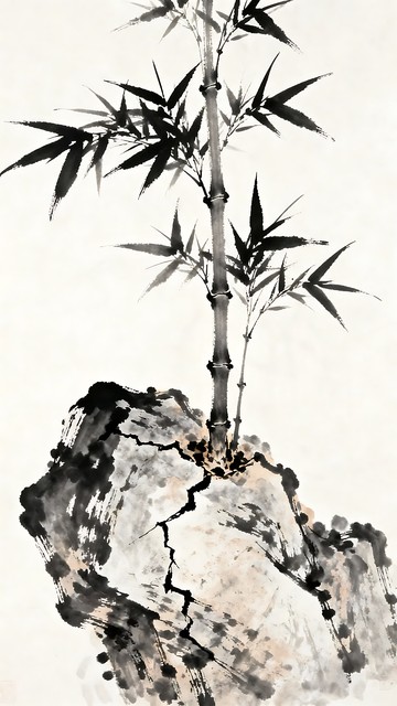 国画中的水墨竹子与岩石,融合传统文人画的黑白色调,展现自然元素之美。