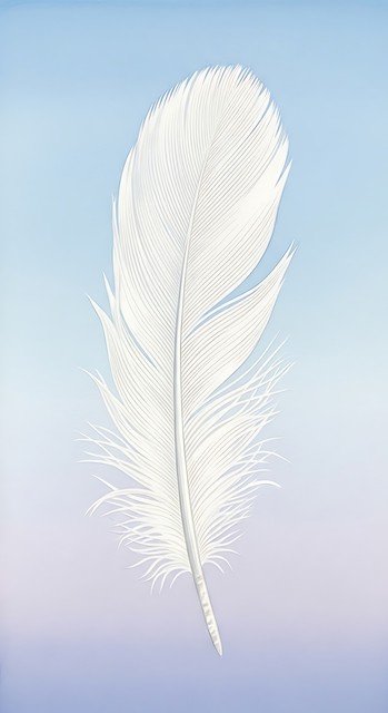 白色羽毛在蓝天背景下,展现出自然元素和唯美艺术的轻柔质感。