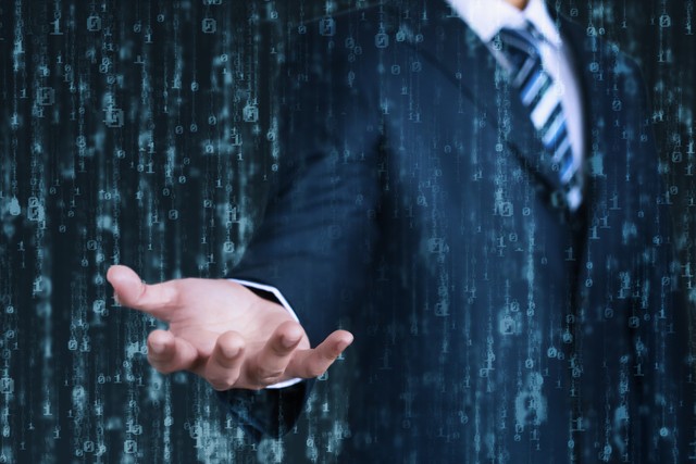 身穿西服的男性透过黑客数字雨探出手掌
