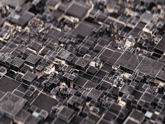 由方形抽象电子芯片元件组成的科技电路板