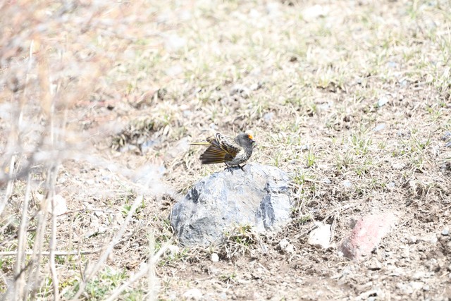 新疆怪石峪:金额丝雀 3月29日,在新疆博州境内的怪石峪景区的内,有许多金额丝雀在草地上寻找食物,吃饱后,它们会到水边地洗澡,过后会在石头上晒太阳并梳理自己的羽毛。金额丝雀是雀形目燕雀科金丝雀属的鸟类。为体小(13厘米)的褐色斑驳的丝雀。栖于海拔2000~4600米林线以上的低矮桧树带或有矮小灌丛的裸岩山坡。多在地面取食。据传,中国只产金额丝雀这一种丝雀。