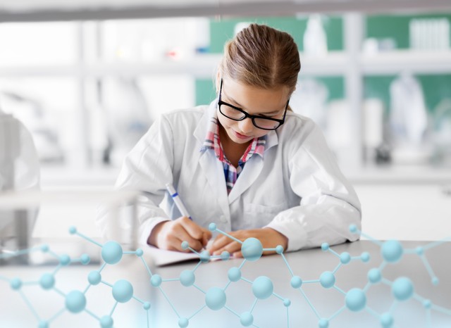 education, science and children concept - girl studying chemistry at school laboratory and writing to workbook. girl studying chemistry at school laboratory