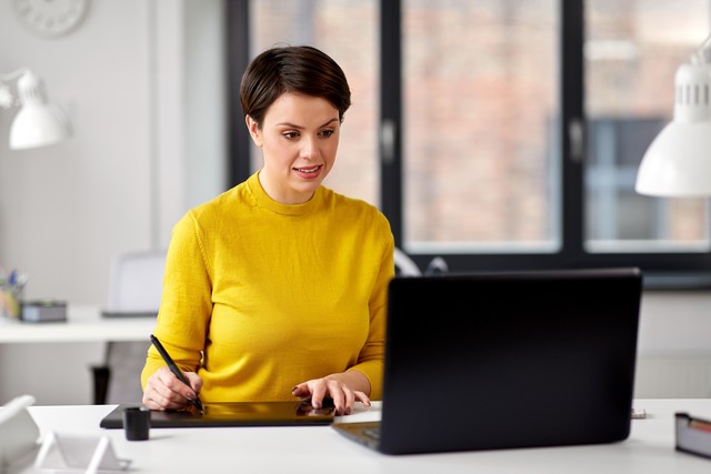 business, design and technology concept - creative woman or graphic designer with pen tablet and laptop computer working at office. designer with laptop and pen tablet at office