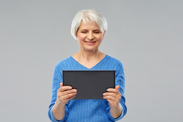 technology and old people concept - smiling senior woman using tablet computer over grey background. senior woman using tablet computer