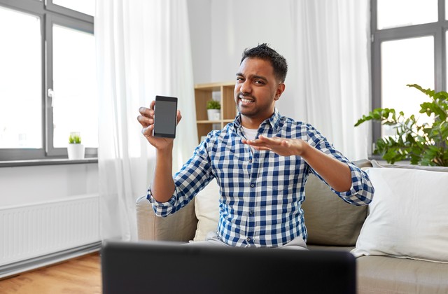 blogging, videoblog and people concept - displeased indian male blogger with camera recording video review of smartphone at home and making so-so gesture. male blogger with smartphone videoblogging