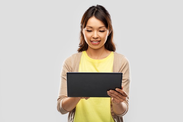 technology and people concept - happy asian woman using tablet computer over grey background. happy asian woman using tablet computer