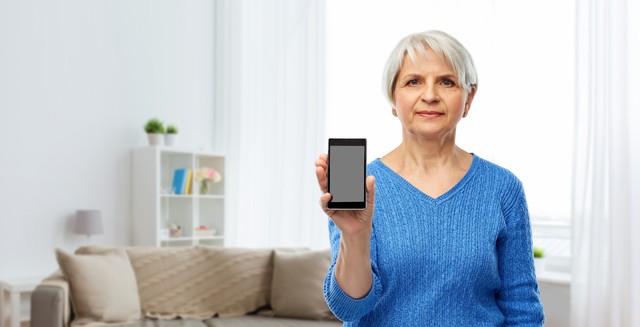 technology and old people concept - senior woman showing smartphone over home living room background. senior woman showing smartphone