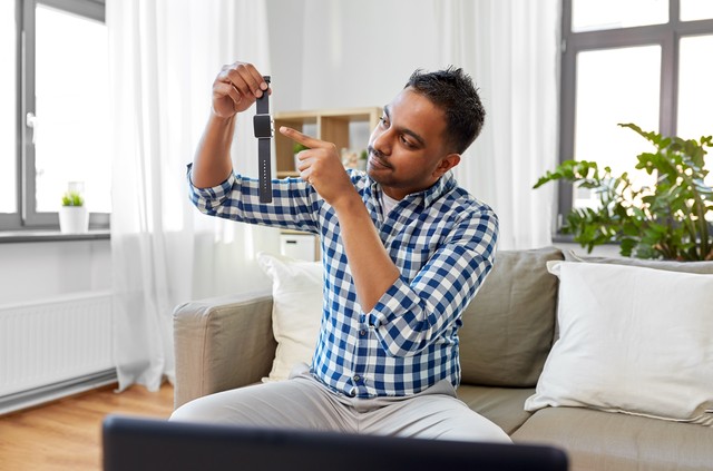 blogging, videoblog and people concept - indian male blogger recording video review of smart watch at home. male blogger recording video review of smart watch