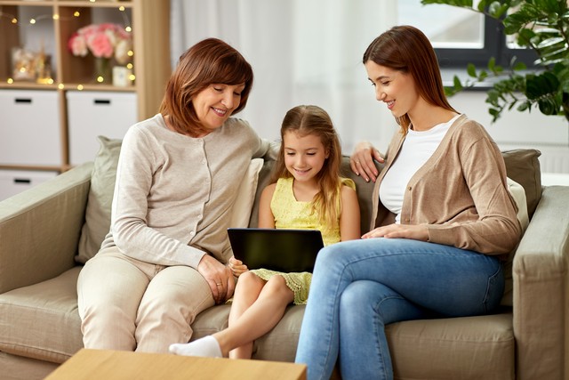 family, generation and technology concept - happy mother, daughter and grandmother with tablet computer at home. mother, daughter and grandmother with tablet pc